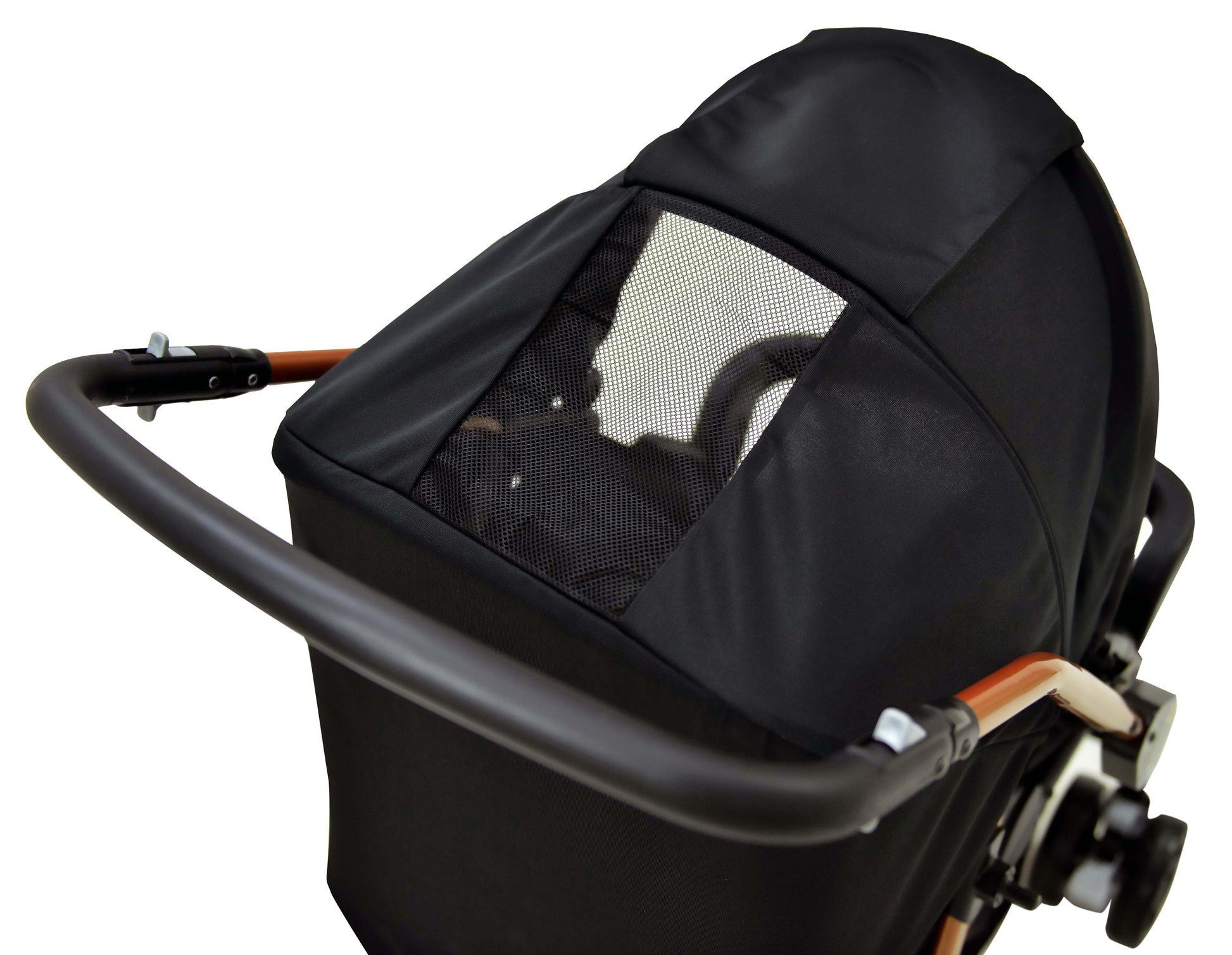 - Capota regulable y removible con visor, que protege del sol y el viento.